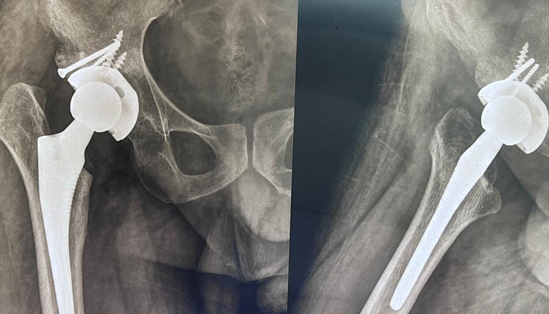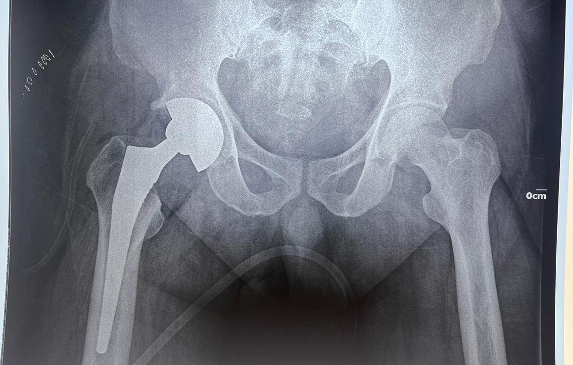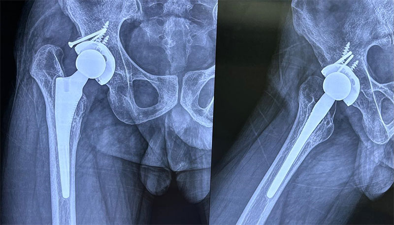 A 32-year-old male with a 7-year history of hip osteoarthritis underwent total hip replacement in 2018, with reconstruction of a false acetabulum using bone graft and screws. A recent X-ray shows a well-fixed implant in good alignment, and the patient reports pain-free walking with a good range of motion.