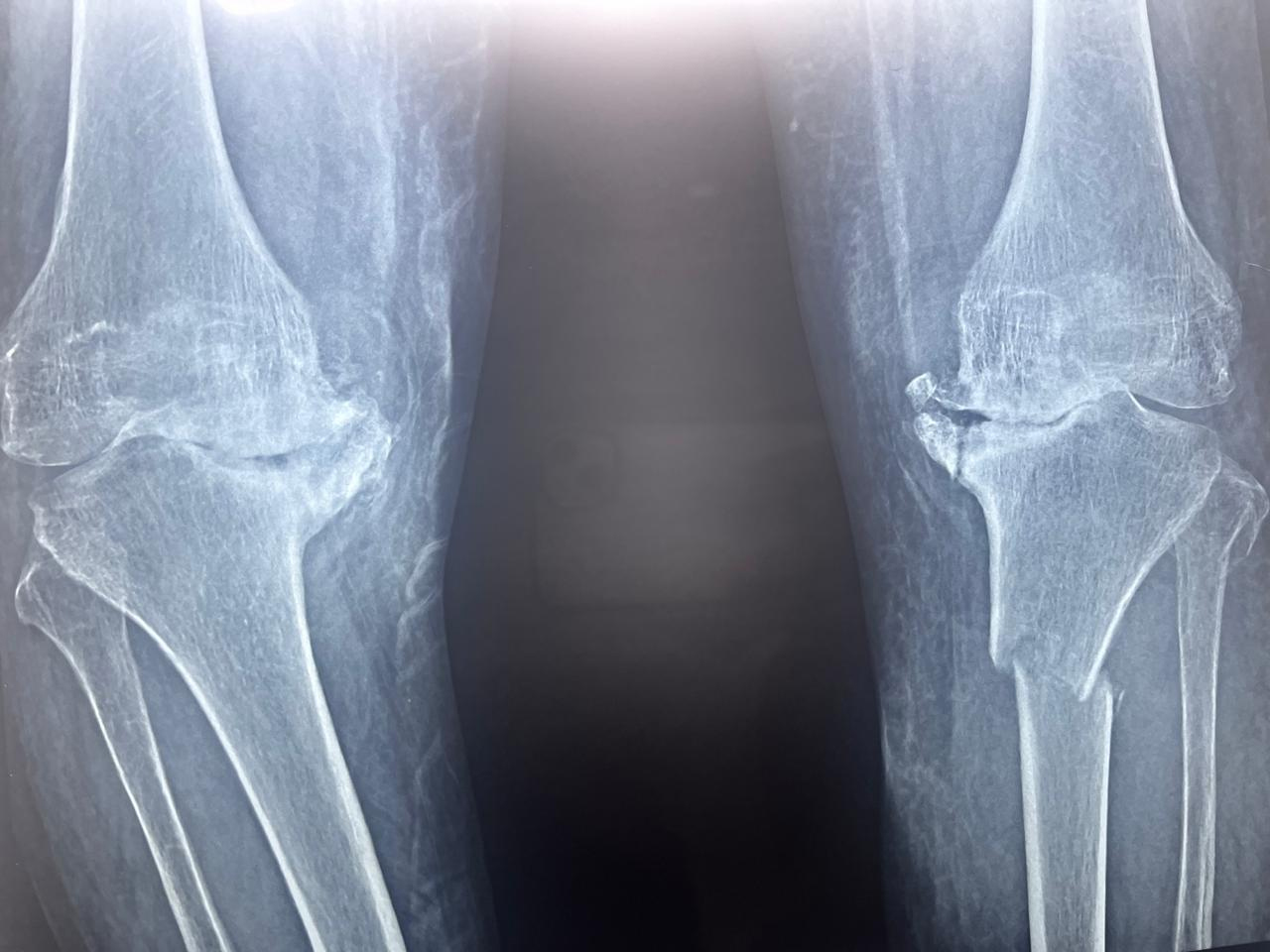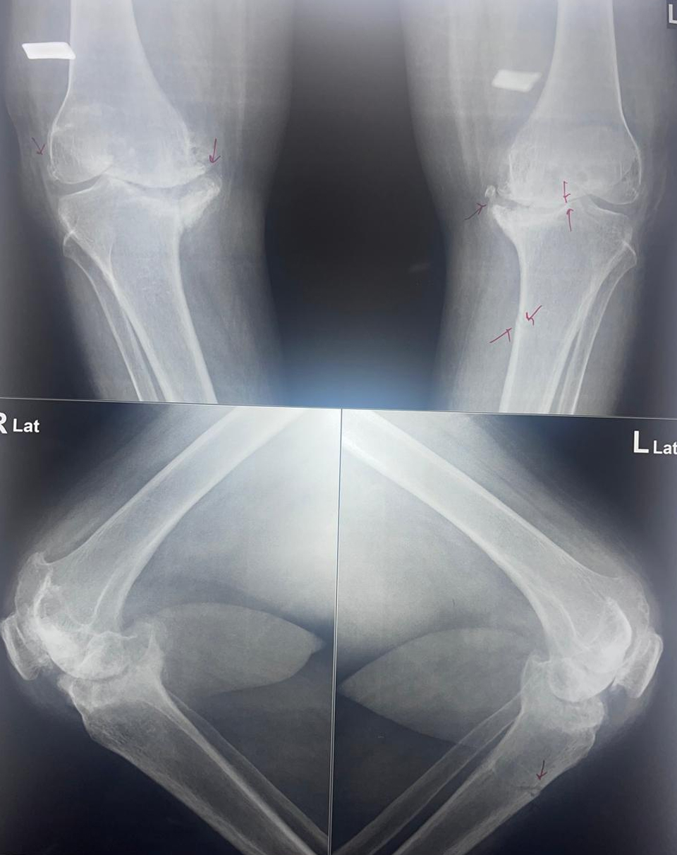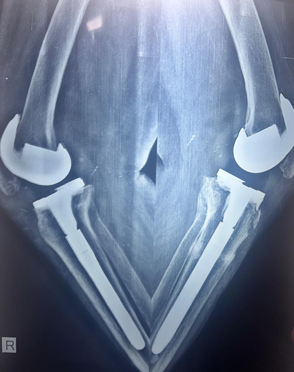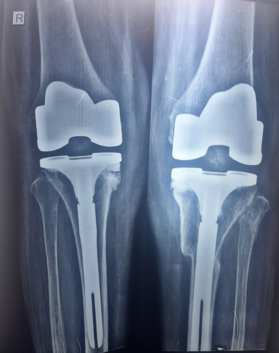 72 years female patient did not walk for 3 months suffered stress fracture of tibis on left side . Bilateral toral knee replacement done with extension rods